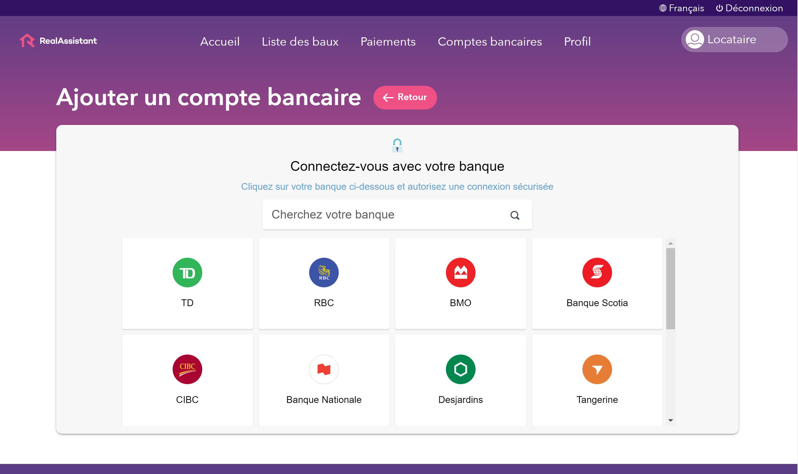 Connectez votre compte bancaire pour traiter rapidement les paiements de loyer en ligne.